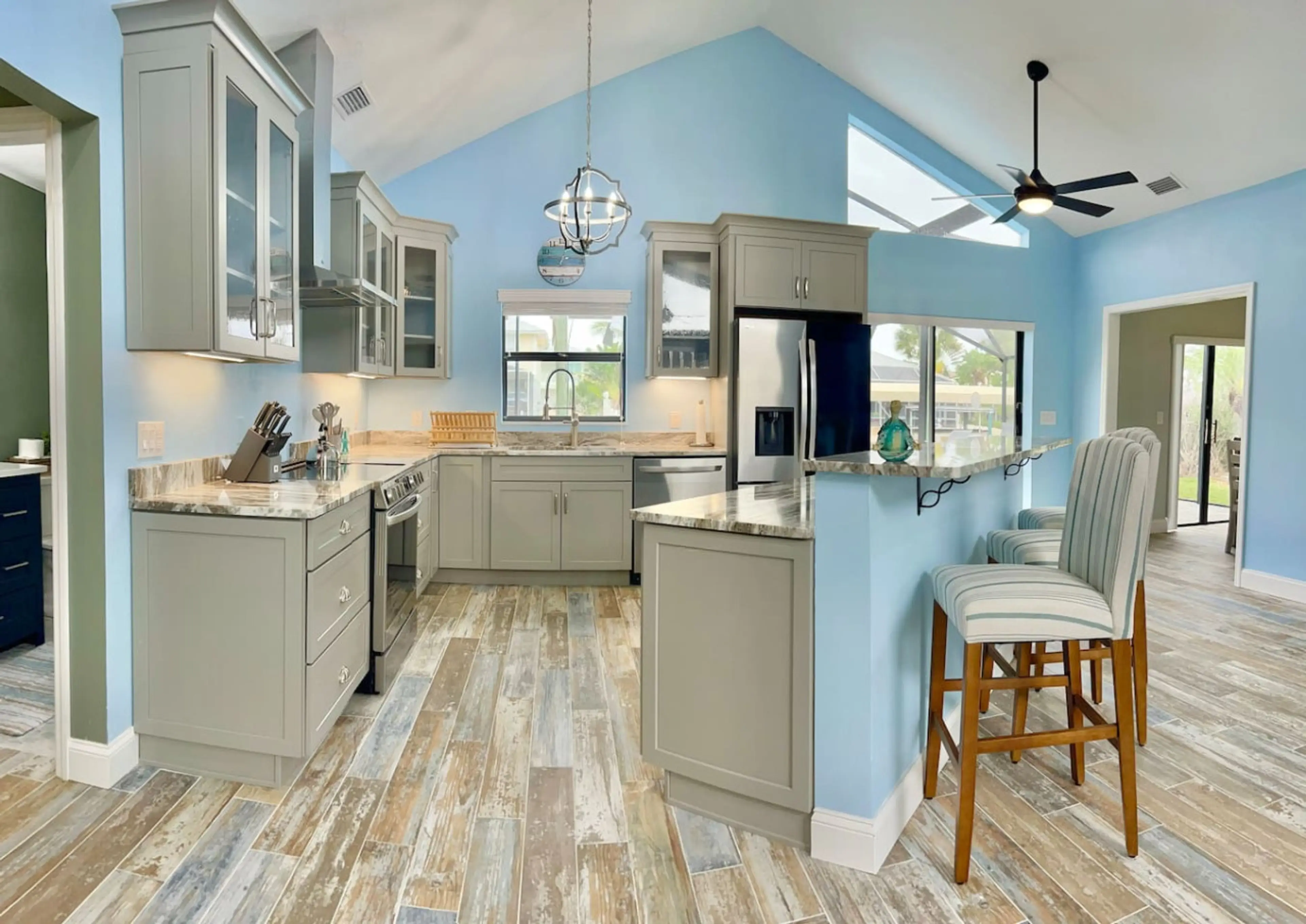 This property has a great pool, kitchen, open-concept living area, and many amenities (a beach wagon, cooler, and washer/dryer). It is within walking distance to a beautiful sandy beach on the Gulf.I believe this is a newer rental due to the extra conveniences that were missing, such as laundry baskets, some kitchen supplies, and a broom/sweeper. There wasn't any communication on how to leave the items in the house (towels, bedding,dishes,etc..), and I think that if the grill and outdoor chairs were covered, they would be in much better shape than they currently are. Also, the rebuilding after Hurricane Ian caused an unexpected traffic problem. All in all, it was great for our family. The kids could swim whenever they wanted and/or watch TV. We made dinner easily in the kitchen.